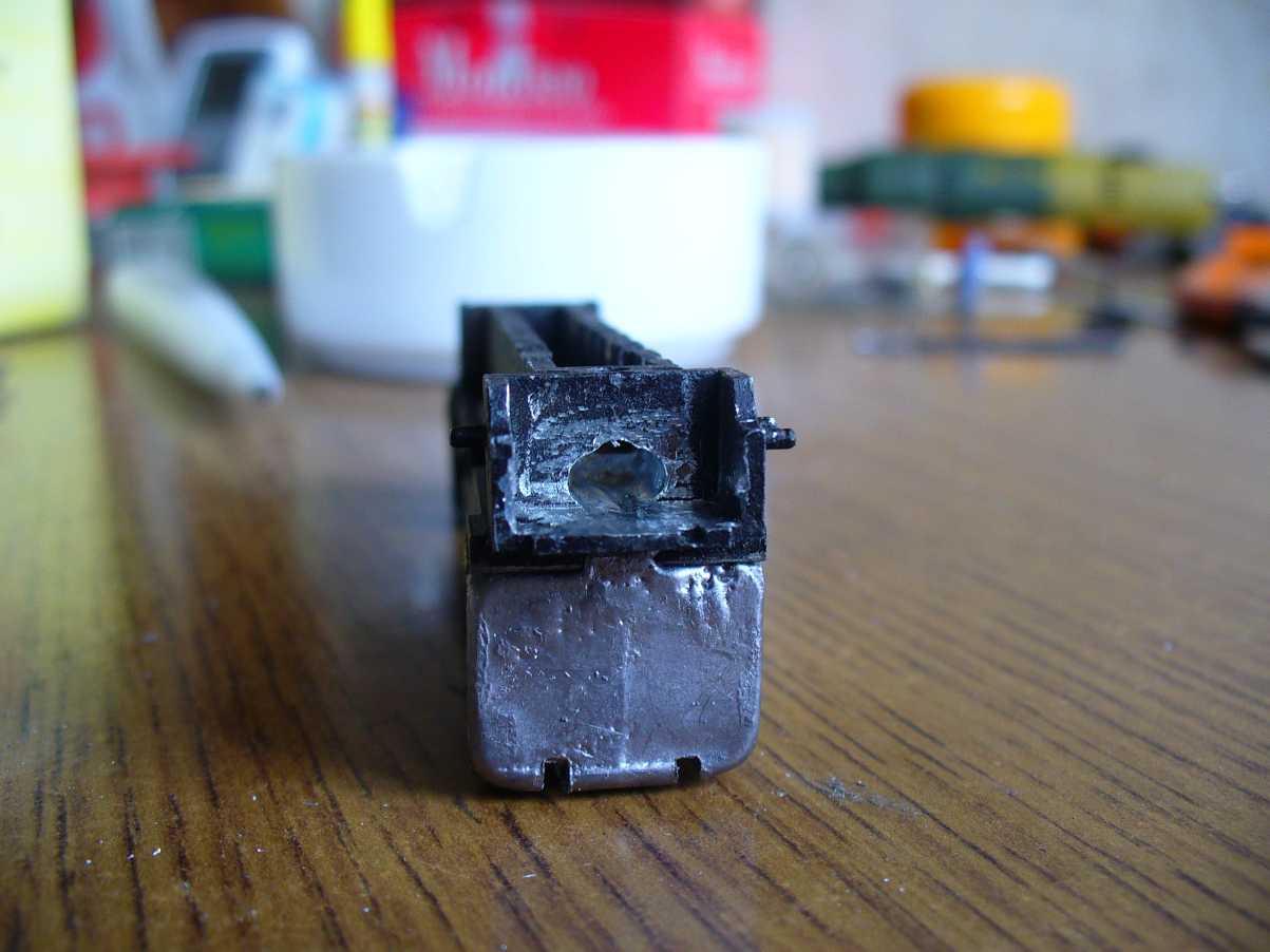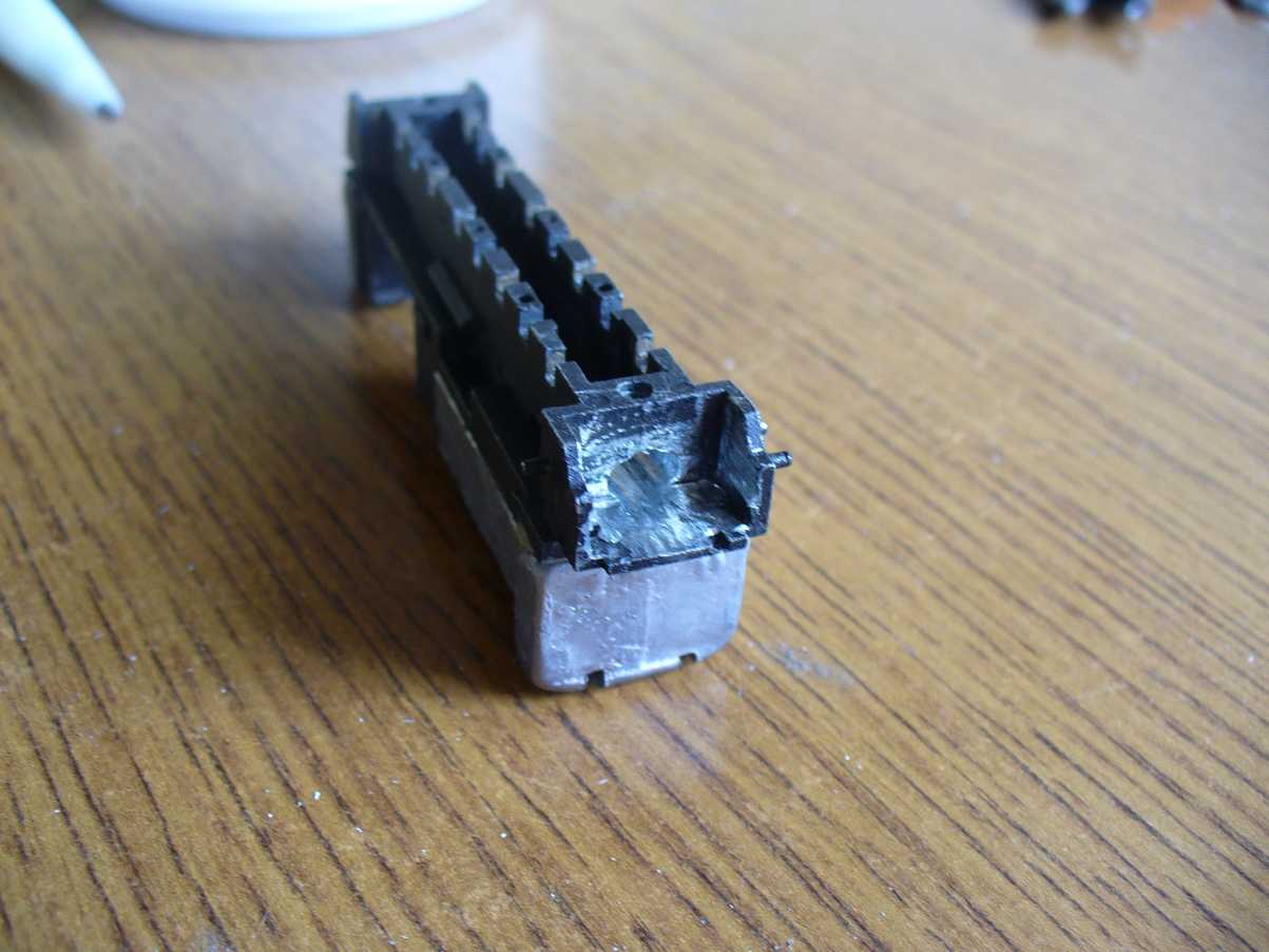 Von vorn wird jetzt zur Lokmitte hin durchgebohrt und diese Bohrung durch